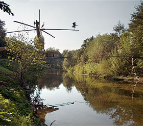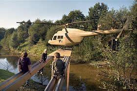 A helicopter (Bell 407) is reproduced in its original size, in solid ash-wood, via the techniques and in the style of traditional local craftsmen, and placed on a 16-meter-long bridge over the Berkel River, in Vreden. Located on the opposite side of the river is the open-air museum of the heavily damaged in World War II city. It includes a number of old farmhouses, and a watermill translocated from the surrounding area. In this reconstructed idyllic rural village, the rotor of the helicopter is set in careful motion with the power of the Hunningschen watermill, which is run by an archaic drive system comprised of a cogwheel, driving gearwheel, and steel shafts. The helicopter and its rotor-motion-via-watermill was realized as part of the Sculpture Biennial Münsterland, in close cooperation with the Vredener Heritage Association, which maintains operations.